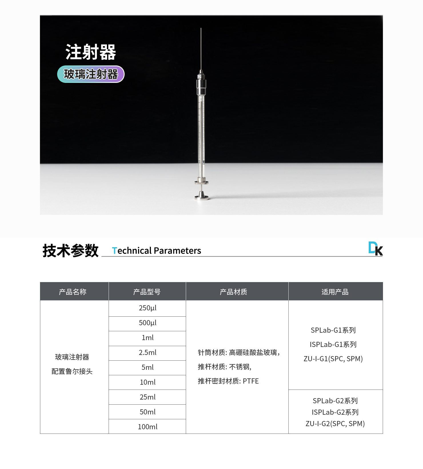 注射器材質(zhì):針筒材質(zhì): 高硼硅酸鹽玻璃, 推桿材質(zhì): 不銹鋼, 推桿密封材質(zhì): PTFE
