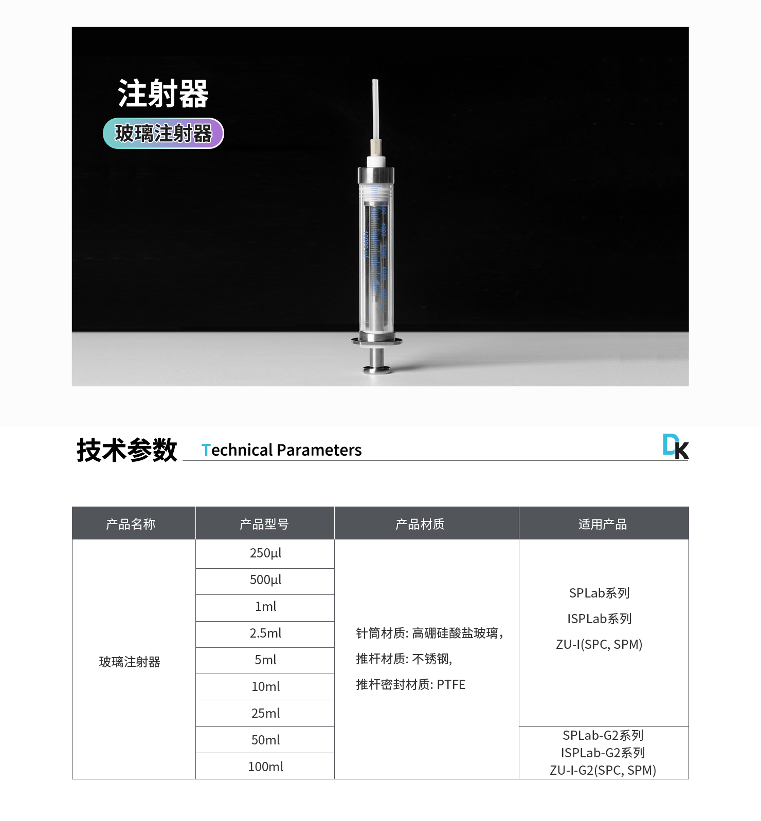 注射器材質(zhì):針筒材質(zhì): 高硼硅酸鹽玻璃, 推桿材質(zhì): 不銹鋼, 推桿密封材質(zhì): PTFE